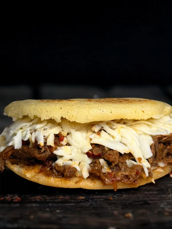 Arepa rellena de nuestra carne mechada y queso a eleccion.